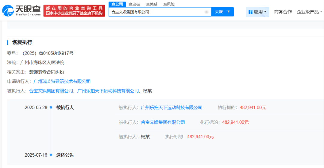 据天眼查此前消息,今年7月,广州市海珠区人民法院向广州乐拍天下运动科技有限公司、合宝文娱集团有限公司及杨某某公告送达执行通知书、报告财产令等材料,要求五日内向法院书面报告现有财产及近一年财产变动情况。