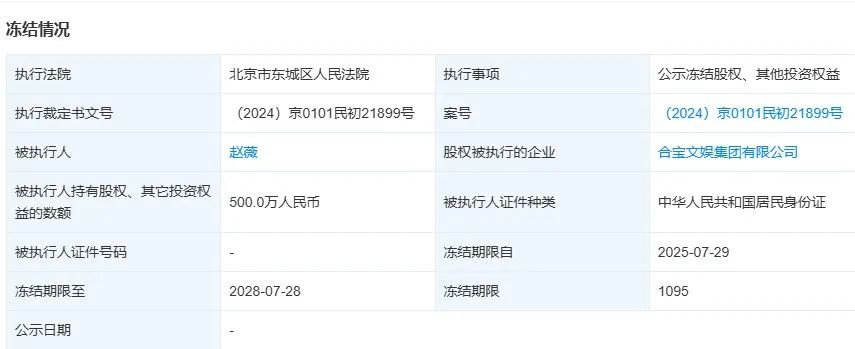 2024年4月,赵薇名下部分所持股权被冻结,冻结股权标的企业为合宝文娱集团有限公司,执行法院为北京市第四中级人民法院,被冻结股权金额为500万元人民币,冻结期限至2027年4月10日。