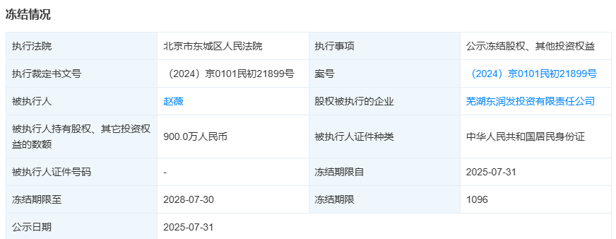 天眼查显示,近日,赵薇所持有的西藏龙薇文化传媒有限公司、合宝文娱集团有限公司、芜湖东润发投资有限责任公司股权被冻结,冻结股权数额分别为190万元人民币、500万元人民币、900万元人民币,冻结期限为3年,执行法院为北京市东城区人民法院。