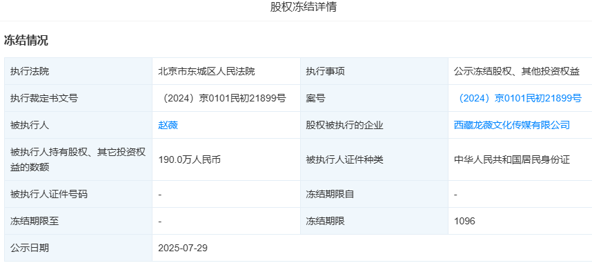 同年11月,据天眼查,浙江祥源文旅(维权)股份有限公司、西藏龙薇文化传媒有限公司、赵薇新增一则被执行人信息,执行金额8488元。此外,上述两公司还被强制执行5689元。