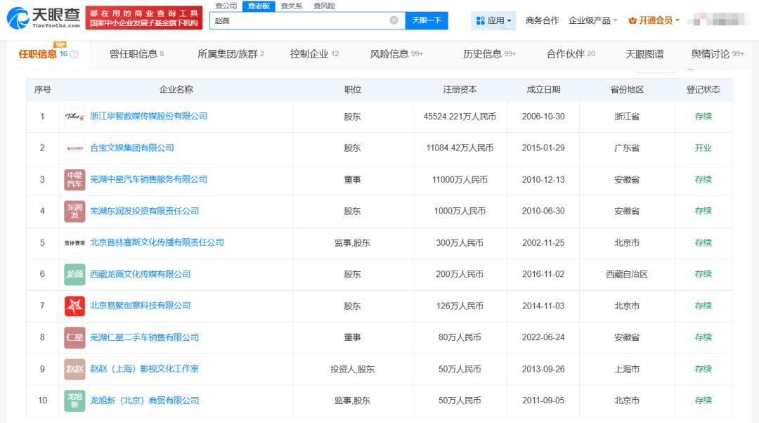近年,赵薇的商业版图不断收缩。天眼查显示,目前,赵薇名下共关联16家公司,其中10家为存续或开业状态,包括芜湖中星汽车销售服务有限公司、合宝文娱集团有限公司、西藏龙薇文化传媒有限公司、北京普林赛斯文化传播有限责任公司等,赵薇在上述公司任股东、董事等职务。